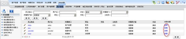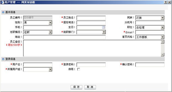 用系统默认的管理员帐号及密码进入系统,根据用户的职责,设置不同的角色及权限,即可完成用户的创建操作。 在系统设置->用户管理中,点击【新建】按钮即可进入用户信息的添加页面,如下图所示: 红色带*是必填项,输入完毕后,点击【保存】,即完成用户信息的创建操作。 注:选择所属的用户组,即该用户默认继承该组的权限,如果不满足,也可根据实际的职责进行权限的修改,如下图: 点击用户信息后的权限链接,进行用户权限的修改。