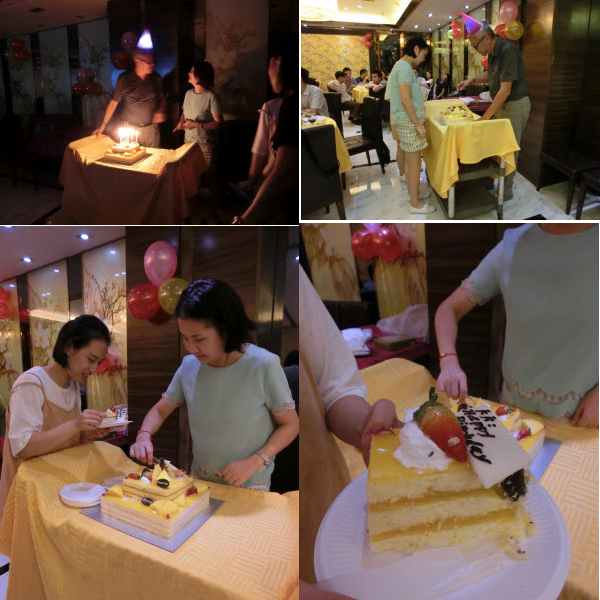 大家酒醉饭饱后,随着一首“祝你生日快乐”熟悉而美妙的旋律响起,用小车推出来一盒精心订制的生日蛋糕。我们点燃生日蜡烛,共同祝福KK老板生日快乐,寿星许下生日愿望,吹熄蜡烛,切开了蛋糕,将现场气氛推向顶点。